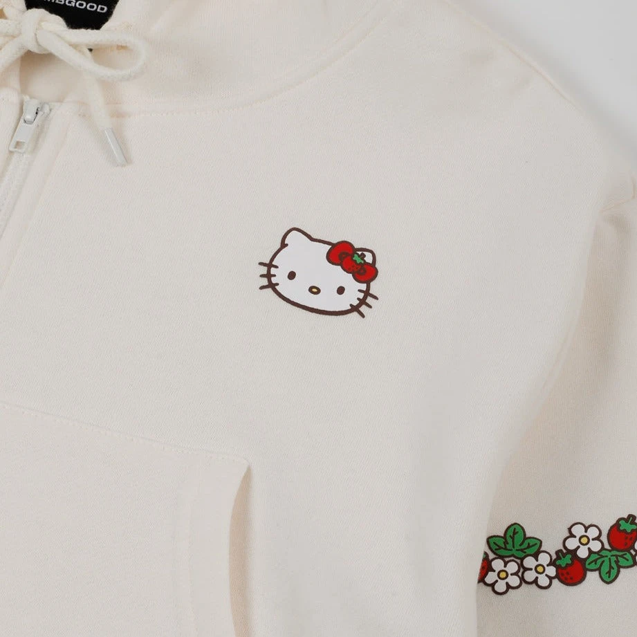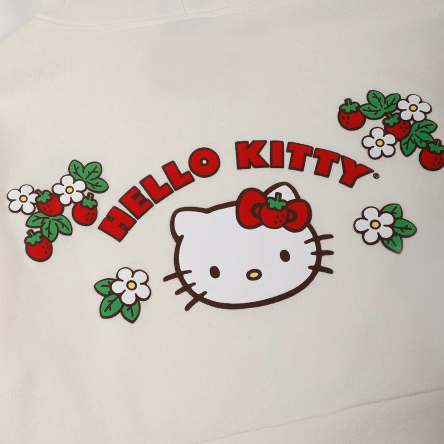 This cropped, zip-front hoodie is berry cute! It has a strawberry blossom design along each sleeve with a large Hello Kitty graphic at the back. Pair it with the matching Hello Kitty Strawberry Tee for a complete look.