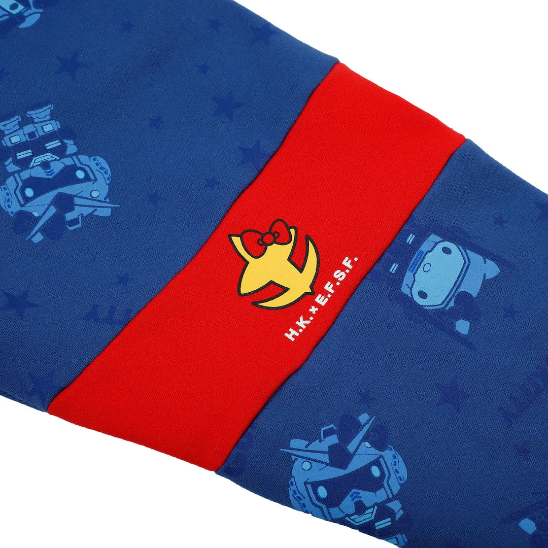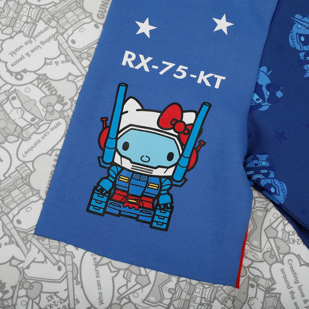 Time to suit up! This colorblocked hoodie features a grey tonal Gundam pattern with contrasting panels of red and blue throughout. There’s a graphic with the Hello Kitty RX-78-2 Gundam at the front with additional mobile suits on the back.