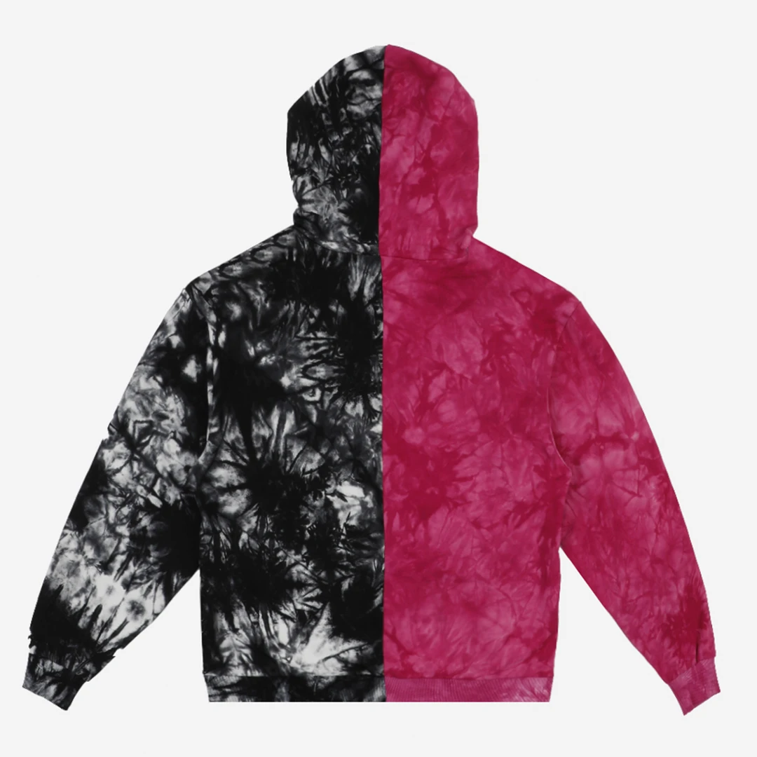 Root for both of your favorite girls with this diagonal split tie-dye hoodie featuring a heart-shaped graphic of Kuromi and My Melody. Each piece is hand-dyed, so every pattern is unique!