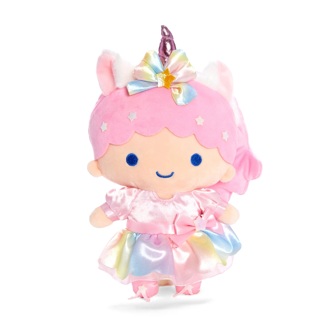 Embark on a magical journey with Lala from LittleTwinStars! This special plush features Kiki as a unicorn with a pink horn, ears, and rainbow tail. Her little satin outfit is so cute! Pair her with Unicorn Kiki for the perfect magical set.
