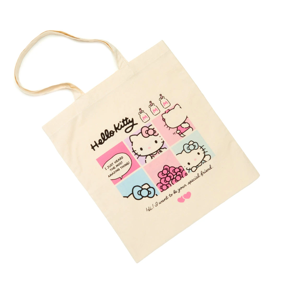 Can’t get enough of Hello Kitty? We don’t blame you! This tote bag features comic-style, paneled artwork featuring your favorite Sanrio character. Finished with her signature at the top and a key character quote, this simple tote carries your daily essentials with ease.