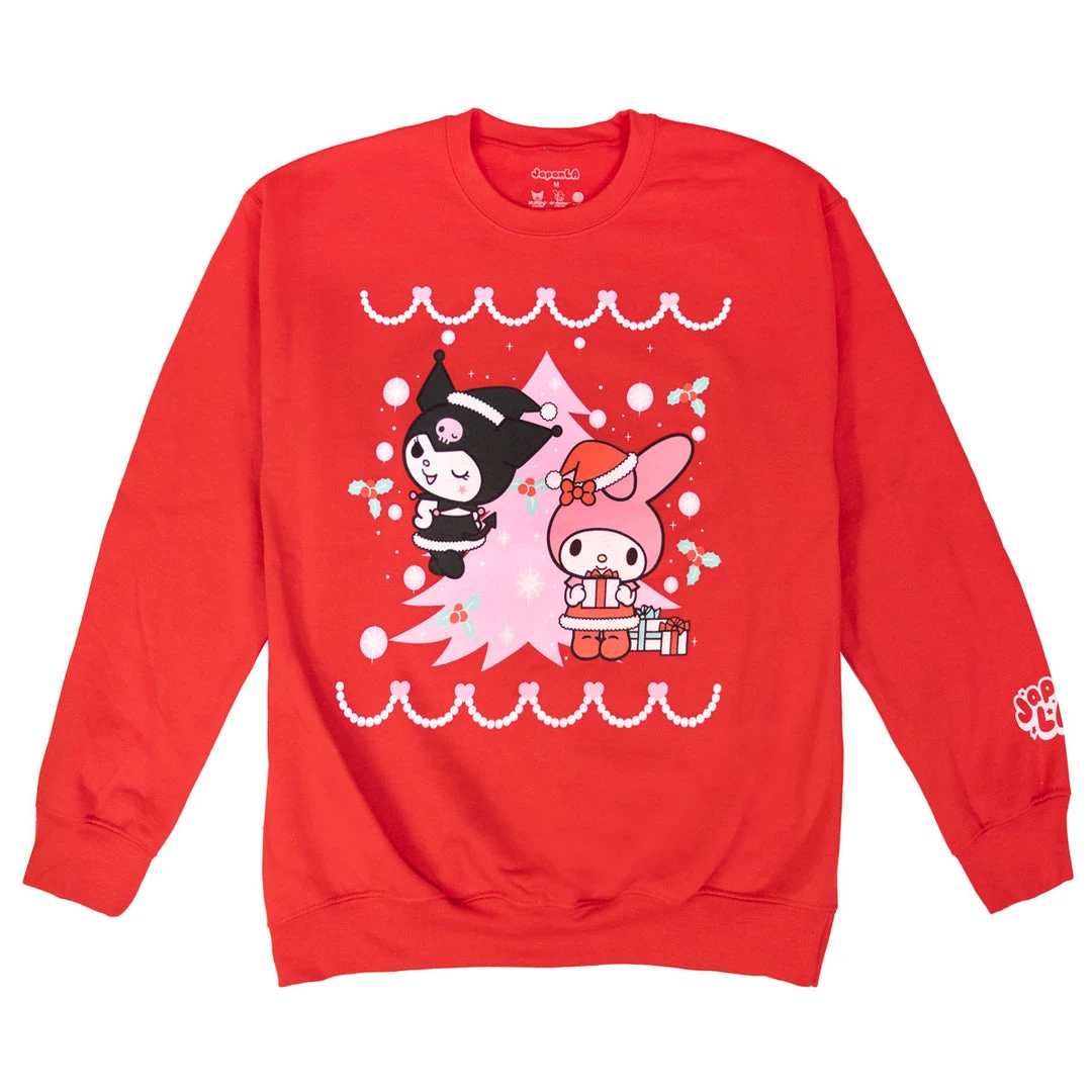 My Melody and Kuromi celebrate the holidays with presents and a giant pink tree on a cozy red pullover sweatshirt!