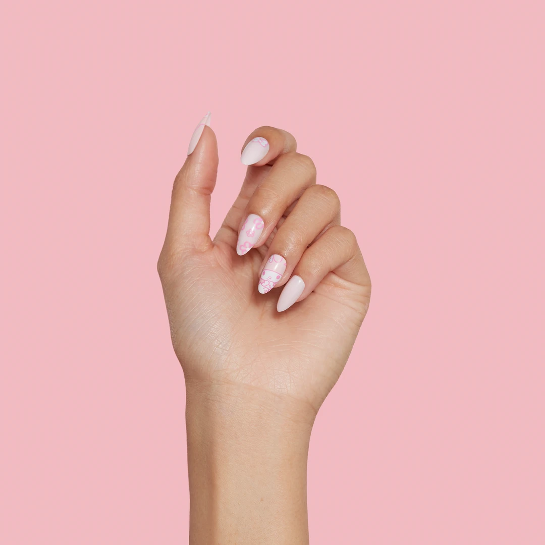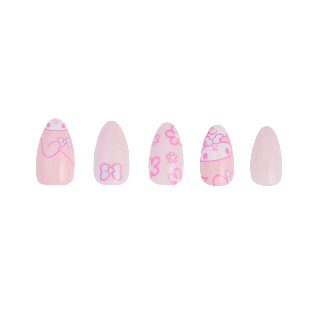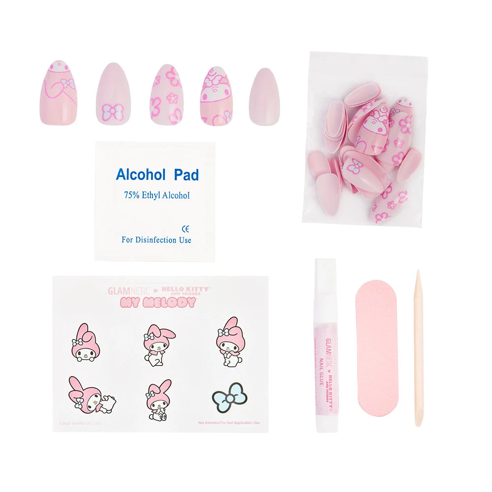Head on your next jet-set adventure with these exclusive Hello Kitty & Friends press-on nails! This My Melody Press-On Nail Kit comes in a short almond shape and features My Melody’s signature cute design with soft pinks and blooming flowers!