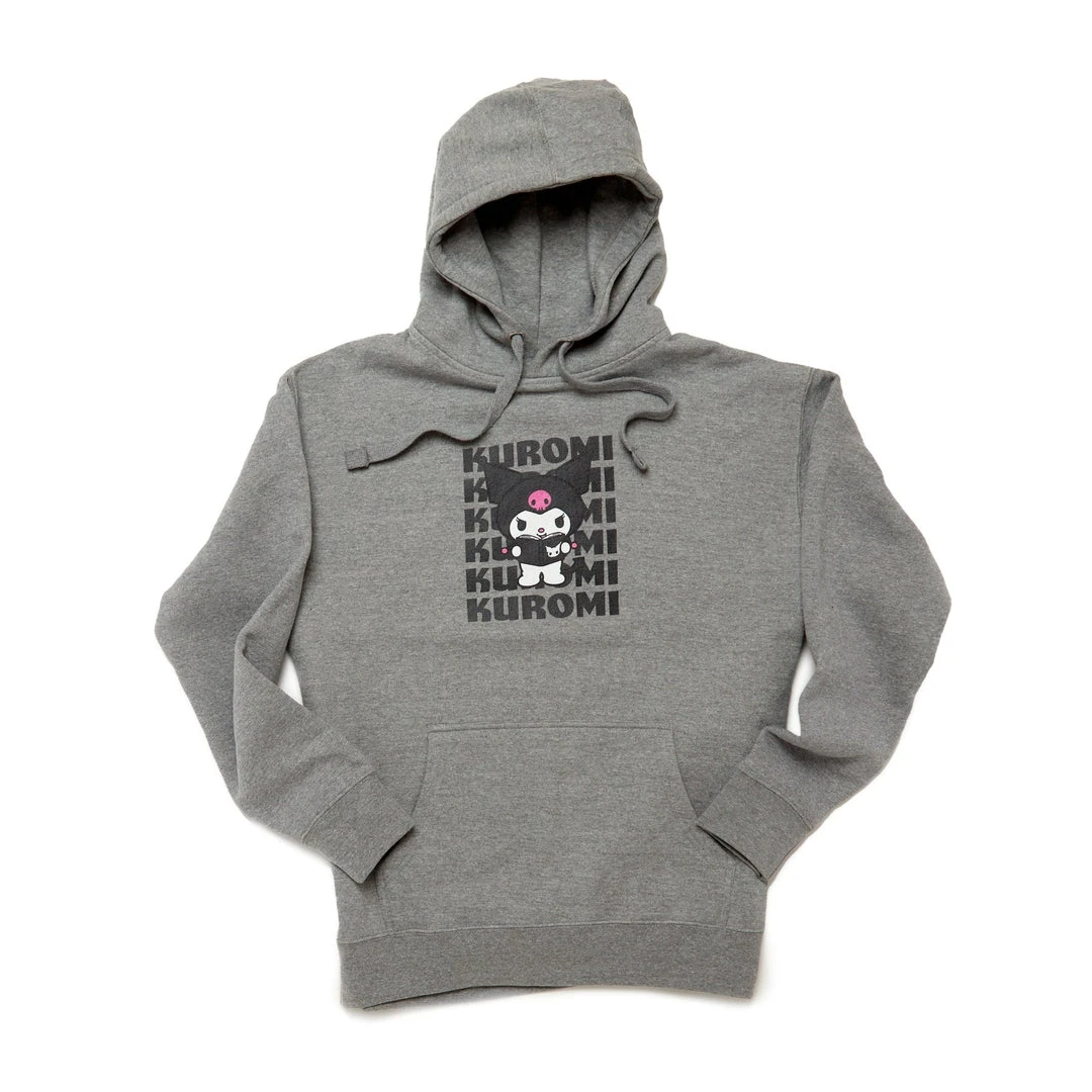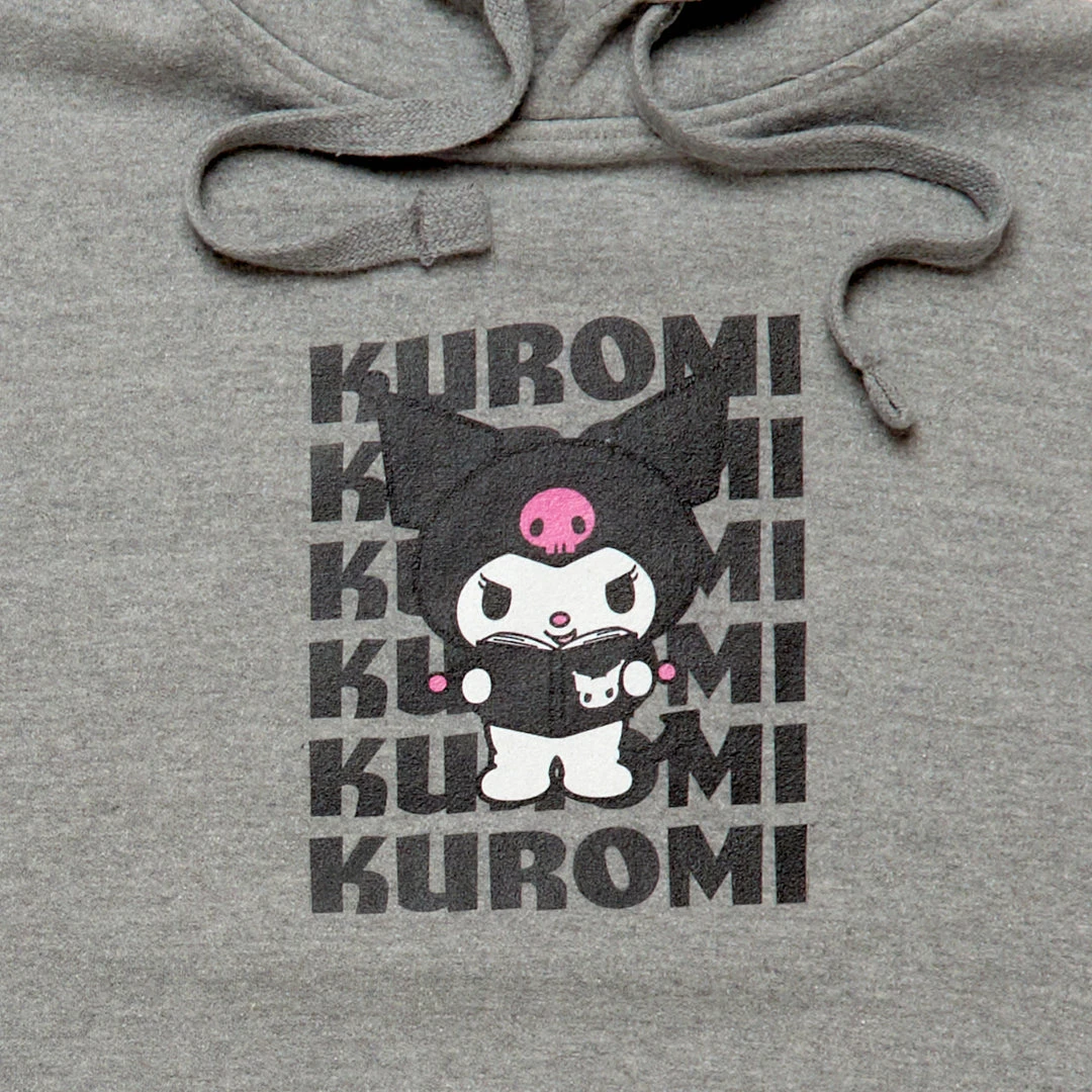 Did you know that “kuro” means the color black in Japanese? This classic gray hoodie has an all-black design with Kuromi front and center!