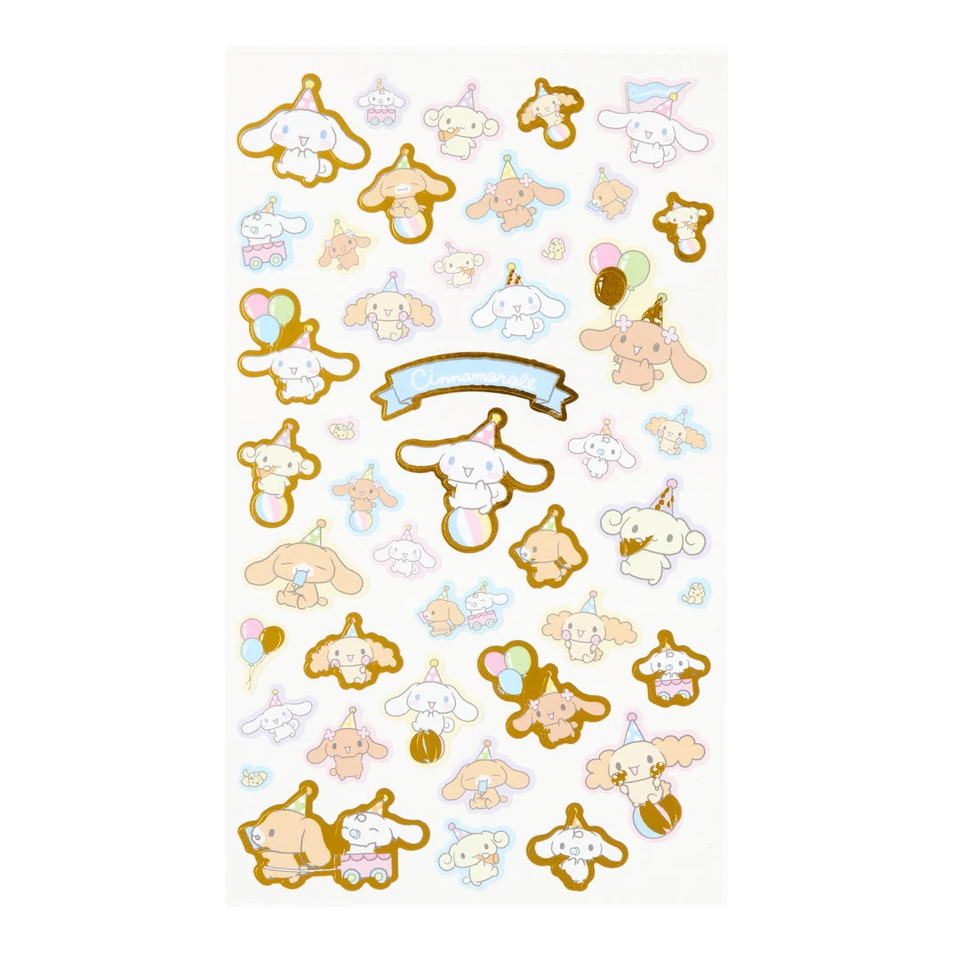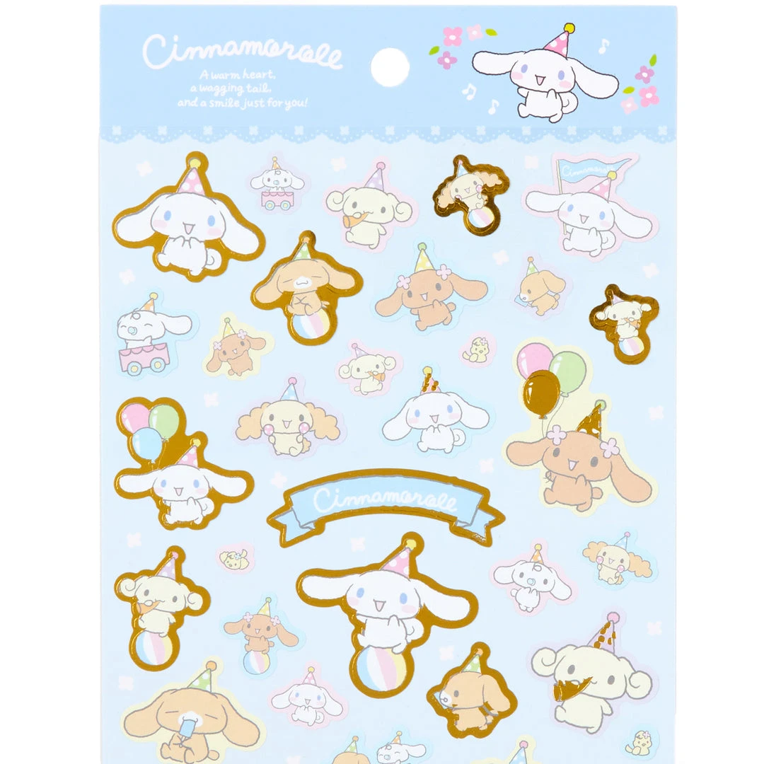 Rep your favorite Sanrio characters with these sticker sheets! Each has a select handful of individual stickers outlined in metallic gold for a luxe and glitzy finish. This sheet features Cinnamoroll with his friends Mocha, Cappuccino, and more!