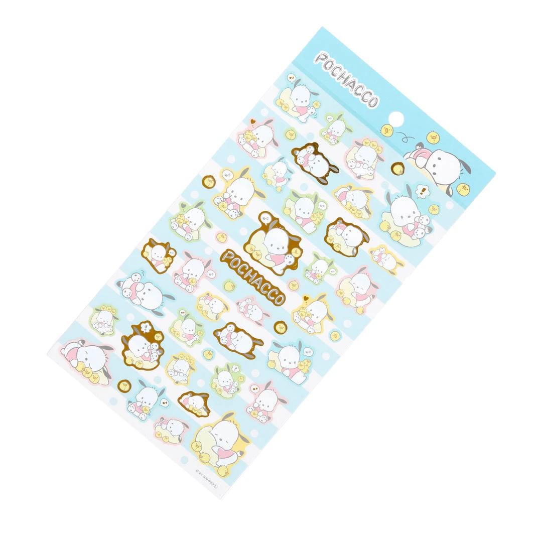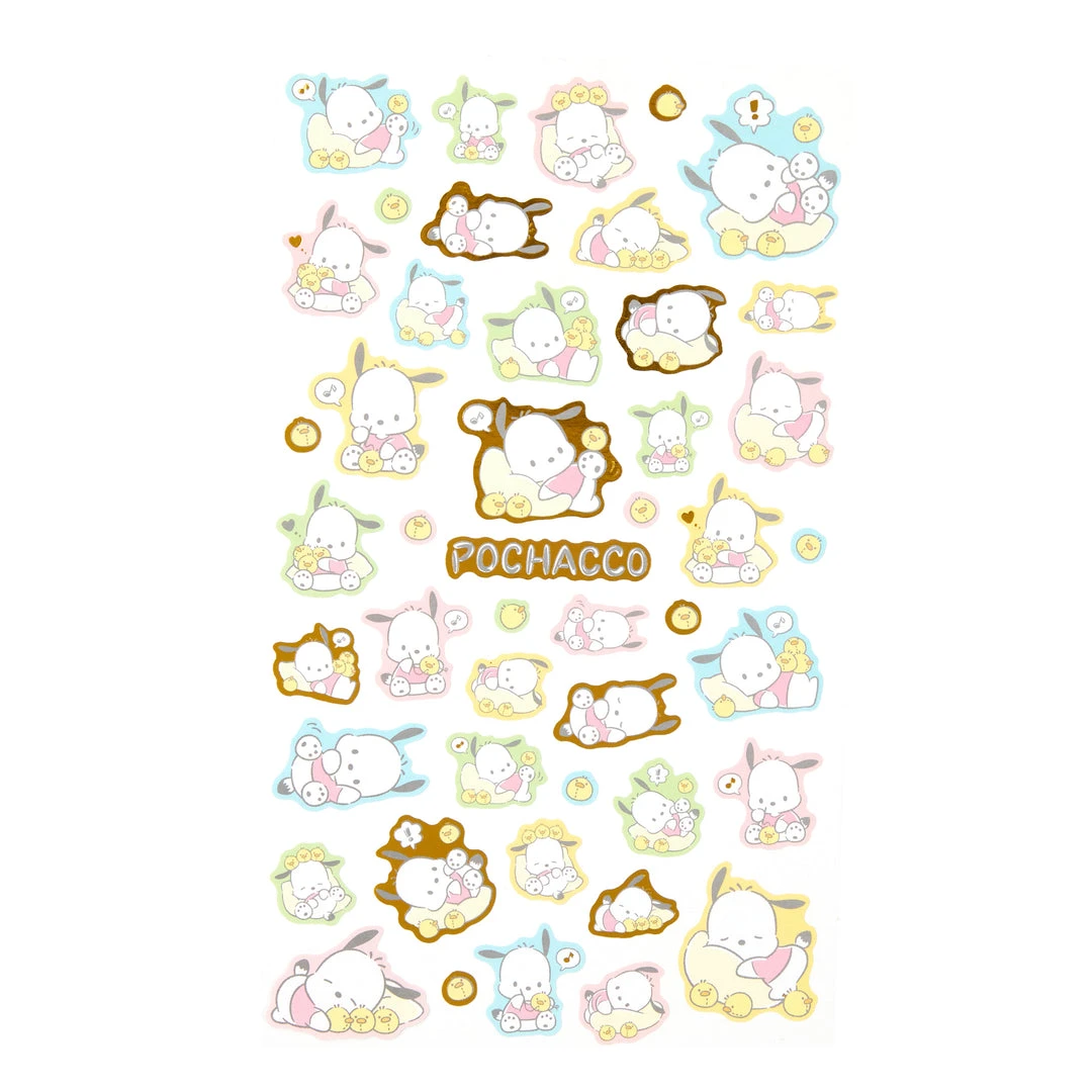 Rep your favorite Sanrio characters with these sticker sheets! Each has a select handful of individual stickers outlined in metallic gold for a luxe and glitzy finish. This sheet features Pochacco loafing around with his besties, the Pi-chans!